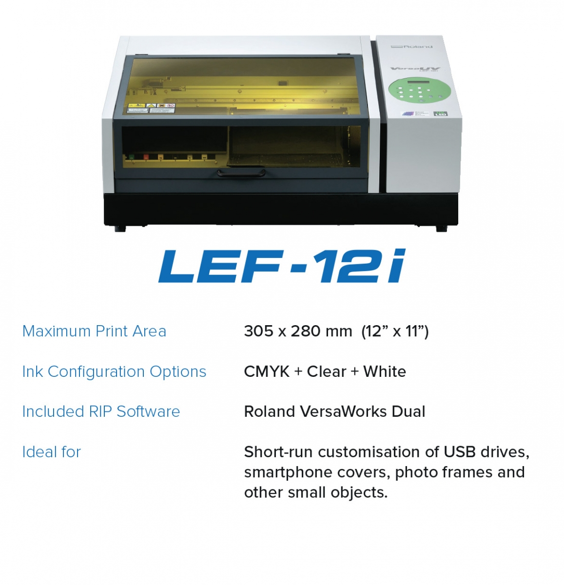 A LEF-12i que é o modelo mais básico e com uma área de impressão de 305 x 280 mm.